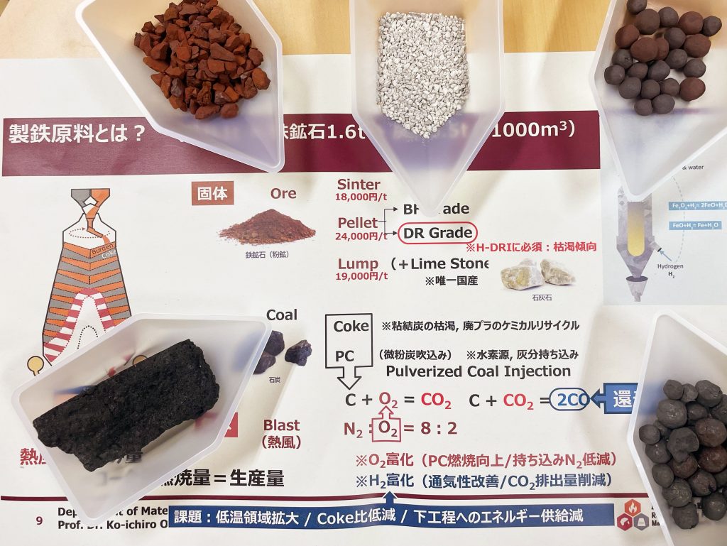 実際の鉄鉱石やコークスを手に取りながら、高炉から水素高炉、H-DRIプロセスまでを紹介し、脱炭素社会に向けた材料工学の役割を一緒に考えました。